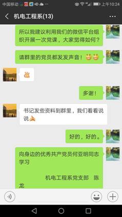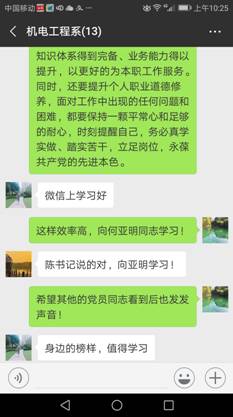 7月14日下午,机电工程系党支部利用系里的微信平台,组织全系党员召开了一次“学习先进模范人物”党课活动。会议由陈龙书记主持,陈书记首先传达了6月29日人社局党组组织的“建党周年‘七一’表彰暨先进事迹报告会”的会议内容和精神,接着给大家上了一堂题为“学习先进模范人物”的党课。