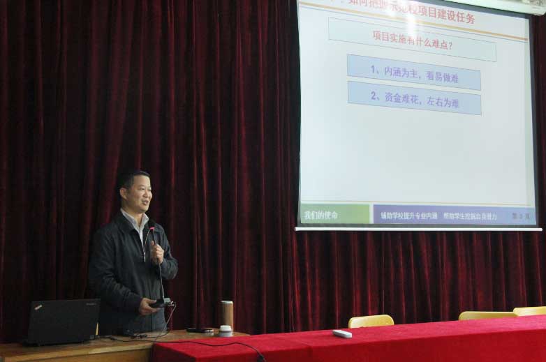 为推进我校中职国家示范学校项目建设,进一步提高教职工对于国示范建设内涵的整体认识,树立专业教师现代职业教育思想,11月13日下午,学校邀请上海厚载智能科技有限公司工学一体化教学研究中心主任、《中国职业技术教育》杂志副理事长王吉连,来校开展“中职国家示范学校内涵建设”讲座。通过学习,专业教师对于我校开展的人才培养模式改革、课程体系改革、教学模式改革、评价体系改革等,都有了更深的认识和理解,将有助于引导教师深度融入专业建设,促进学校整体办学质量的提升。