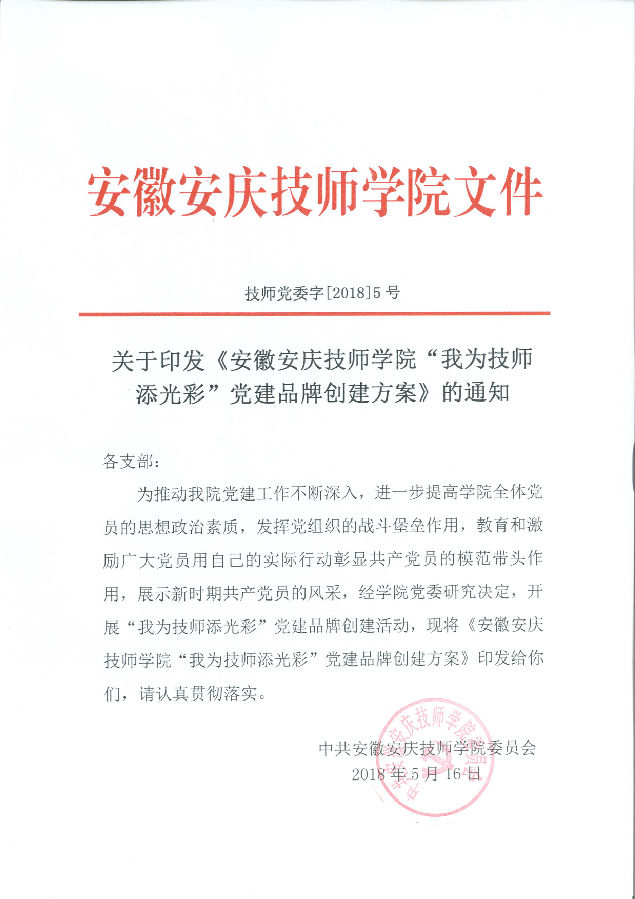 安徽安庆技师学院 “我为技师添光彩”党建品牌创建方案