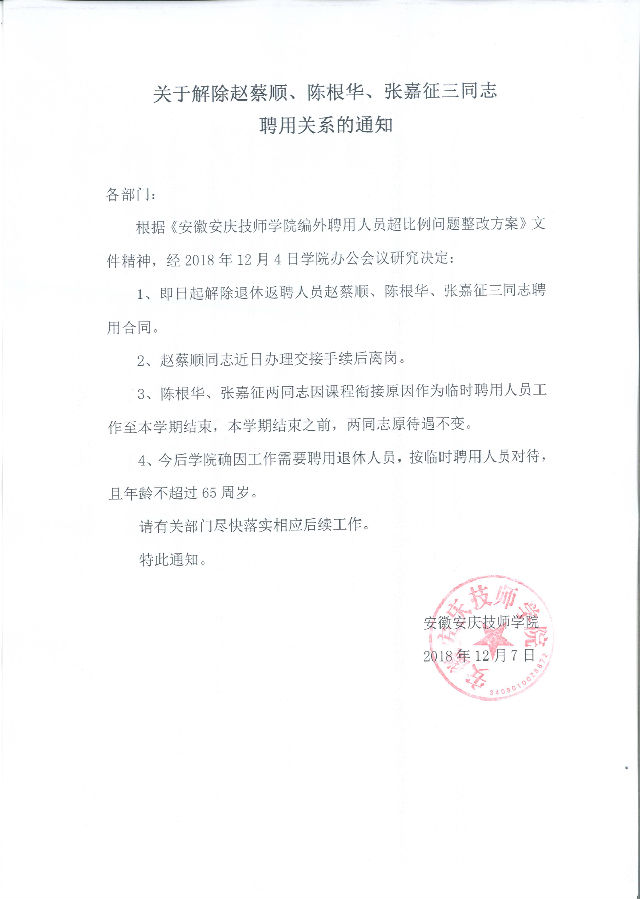关于解除赵蔡顺、陈根华、张嘉征三同志聘用关系的通知