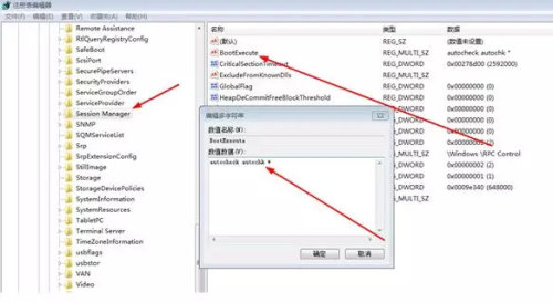 将右边的 BootExecute 键值(系统默认为autocheckautochk *)备份后删除掉,阻止该程序自动再启动后续进程。