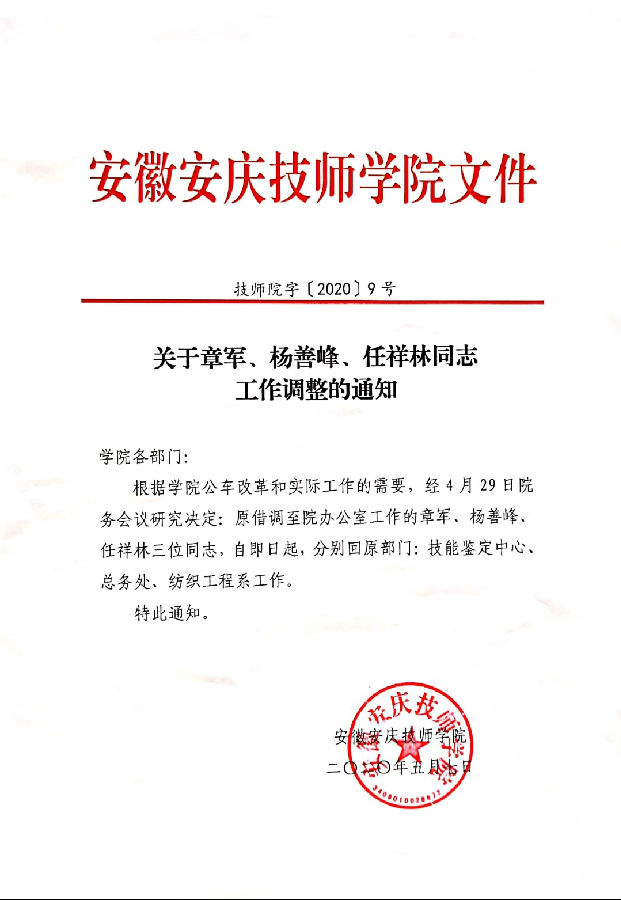 关于章军、杨善峰、任祥林同志工作调整的通知