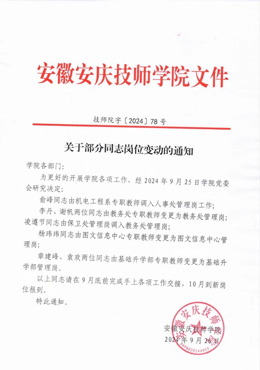 关于部分同志岗位变动的通知