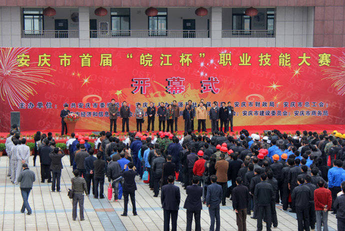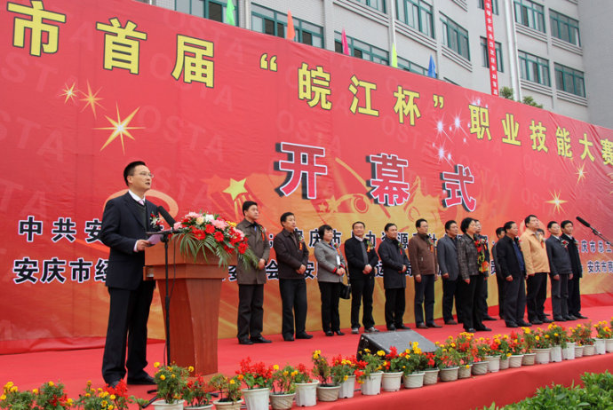 11月10日上午八时三十分,安庆市首届“皖江杯”职业技能大赛开幕式在安庆技师学院隆重举行,市政府副市长张君毅和各主办单位的负责同志出席开幕式,市政府副秘书长罗光彪主持了开幕式。来自安庆市八县(市)四区的对口部门的领导、八县(市)四区以及安徽华茂集团、安徽曙光化工集团、安庆环新集团、安庆英德利集团、安庆中船柴油机有限公司、安庆车桥长、解放军第四八一二工厂、安庆尊悦酒店有限公司、安庆华源劳务有限公司等九个知名集团公司共二十一个代表队的领队、教练、参赛选手和各承办单位的工作人员参加了开幕式。