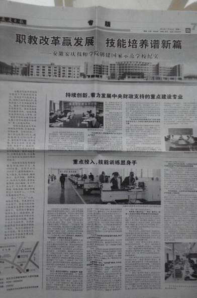 2014年7月28日,《安庆日报》设立专版,对学院所属安庆市纺织技工学校“创建国家中职教育改革发展示范学校”项目,自2014年4月以来,所开展、推进的全面工作进行了报道。报道题为“职教改革赢发展  技能培养谱新篇”,报道主要内容为: