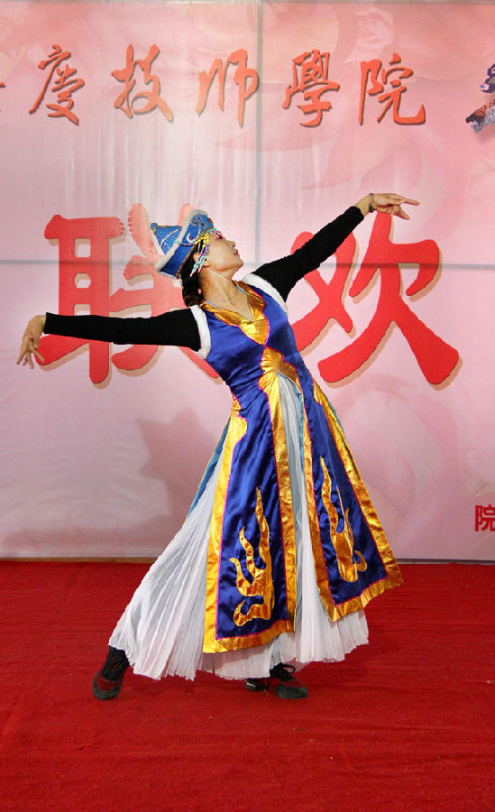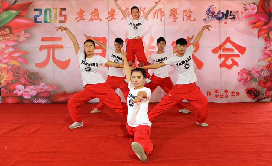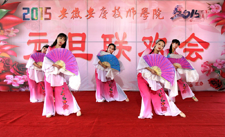 2014年12月30日下午安徽安庆技师学院2015年元旦联欢会在学院举行,学院分管领导朱清代表学院党委和行政班子向全体教职工和同学们表达了新年的祝福。联欢会在《好运来》的舞蹈中拉开帷幕,由老师组成的评委团评出《欢快地跳》、《月半小夜曲》、《战台风》分别荣获舞蹈类、歌曲类、才艺类第一名。