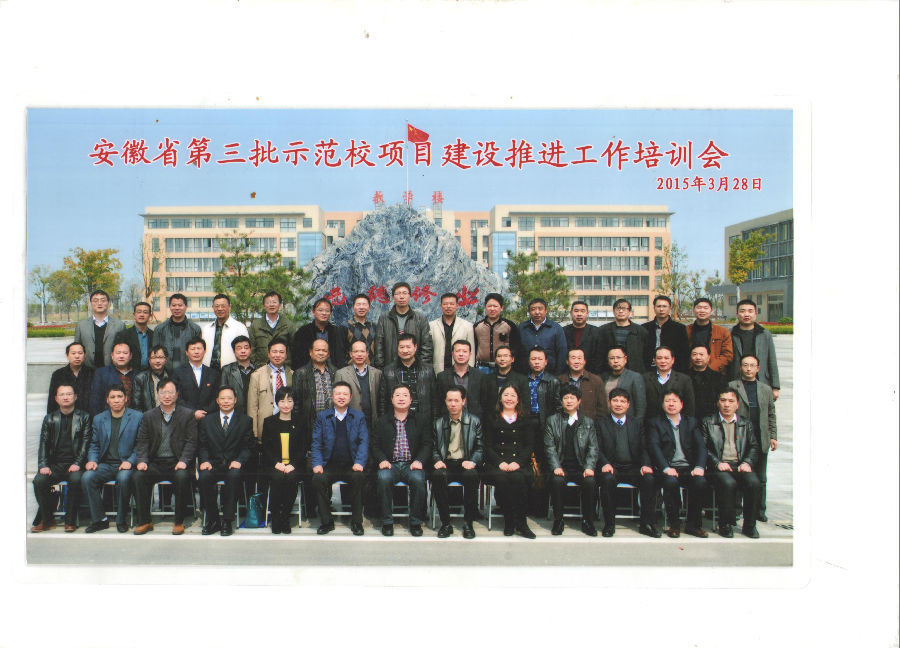 安徽省第三批国家示范校项目建设推进培训会,于2015年3月27日至28日,在安徽科技贸易学校召开。会议由教育厅职成教处主办,陈锋副处长主持。会议对我省第三批示范校中期检查情况作了通报与总结。培训期间,省专家组成员朱国苗作了关于示范校建设与迎检工作的讲话,外省专家李立新处长作了示范学校项目建设主题讲座。