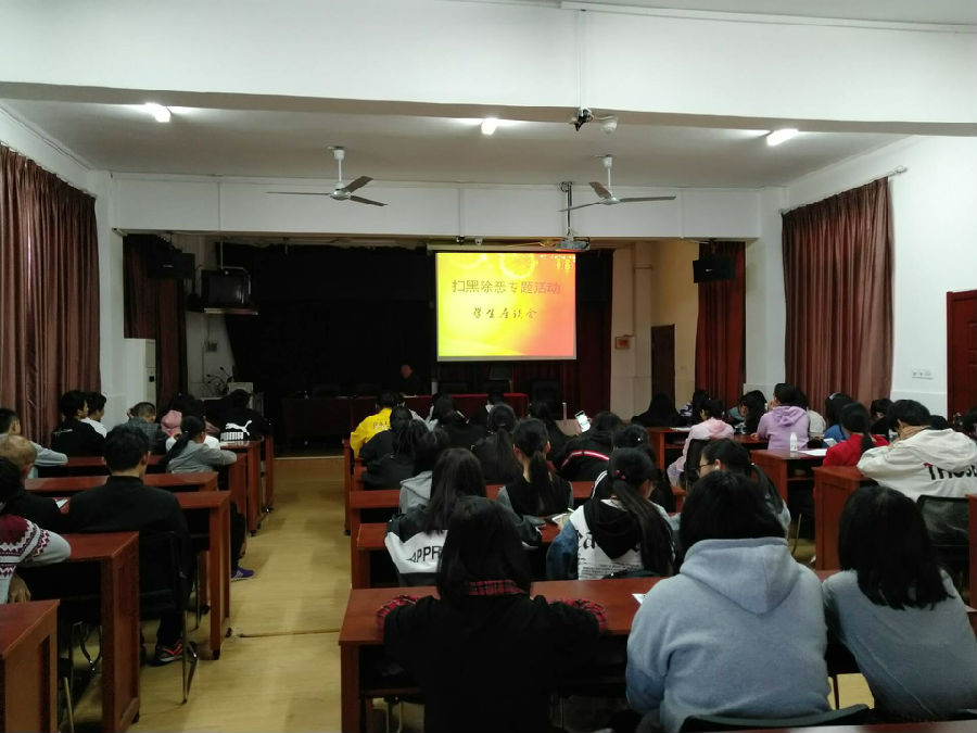 学院各部门在扫黑除恶斗争中积极行动,认真组织学习,加大宣传力度。各系部、图文信息中心、团委等部门充分利用校园广播、墙报、主题班会、集会、电子屏等进行扫黑除恶宣传教育;学生处组织召开学生座谈会,宣讲扫黑除恶的重要意义和要求,了解学生动态;并向各班级发放涉黑涉恶线索排查表,排查内容为发生引诱学生吸食毒品、吸纳学生参与赌博或网络赌球、向在校生放“校园贷”、“裸贷”、传播涉邪教视频、校外人员对在校学生实施暴力侵害或勒索钱财以及有组织的干扰学校正常程序等现象,从排查反馈看,情况较好,无涉黑涉恶现象发生。