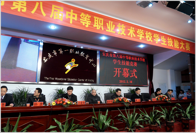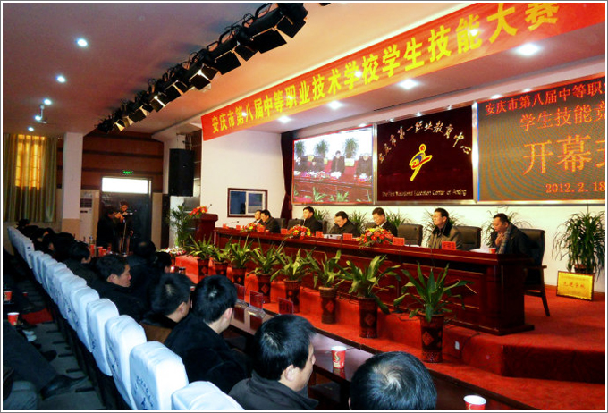 2012年2月18日上午安庆市第八届中等职业技术学校学生技能大赛各比赛项目全面展开,全市各中等职业学校参赛选手云集赛场。上午九时大赛开幕式在安庆市第一职业教育中心会议中心隆重开幕,市政府副市长黄杰、市政协副主席市教育局局长童学军、省教育厅职成教处处长燕贵忠、市人社局副局长许建南、市教育局副局长林华亮、各县教育局分管职业教育的局长和各参赛队领队应邀参加开幕式,黄杰、童学军、燕贵忠等领导先后致辞发言。政府副市长黄杰在开幕式讲话中要求各级有关部门和全市中职学校坚持面向社会、面向市场办学,进一步深化职业教育教学改革,不断提高办学质量,为安庆的发展提供技能型人才。同时希望广大中职学生加强学习、苦练技术,努力成为知识全面、技术精湛的合格职业劳动者。开幕式结束后,出席会议的各位领导视察了各赛点比赛情况。