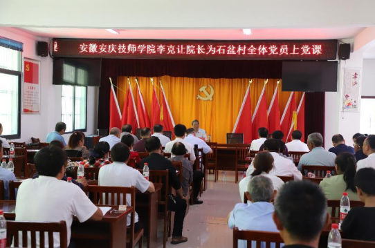 在石盆村大会议室,李院长以“发挥党员示范作用,推进石盆乡村振兴”为主题,为该村党员干部、群众代表、结对帮扶干部、驻村工作队员等50余人上了一堂生动的党课。他首先从理论高度阐述了乡村振兴工作的重大意义;继而结合村情,用通俗易懂的语言,深入剖析石盆村在推进乡村振兴工作中“怎样做”、“做什么”、“谁来做”等方面的问题。在阐述“怎样做”时,他强调石盆村要以产业项目为载体,要多研究政策,要结合自身的条件和特点超前谋划、同时也要循序渐进、日积月累的做。党员干部尤其是村两委、帮扶工作队都要有“功成不必在我,功成一定有我”的精神。在阐述“做什么”时,李院长将村两委的工作重心形象地概括为两点:挣钱与花钱。他着重指出,挣钱方面,一是依靠项目,二是发展村集体经济,其中很重要的一点就是要提高农民的务工技能,石盆村年轻学子可以到我院来学习技术、提升挣钱本领。在花钱方面,一定要将钱用在刀刃上,让广大村民有真切的获得感,同时在乡风民俗建设上,要大力提倡勤俭节约、移风易俗、健康娱乐。在阐述“谁来做”时,他指出要依靠当地党委,在乡村振兴工作中,一个党员就是一面旗帜,要发挥领头羊的作用,体现党的先进性,发展经济要对党员能人大户的传帮带寄于厚望。李院长对驻村工作队提出特别要求,要求他们坚守“三心”,一是安心,驻村如驻军;二是真心,真心为民拿出实招;三是凝心,真帮助,办实事,提升水平,实走访,防返贫,稳增收。
