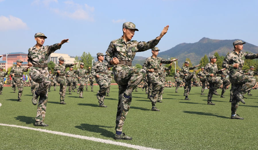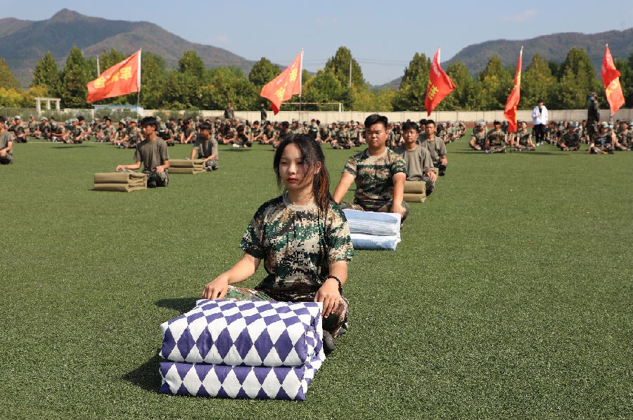 军训成果展示:(1)集体队列展示(2)《国家》手语操(3)军体操(4)三声三相(5)叠被子比赛