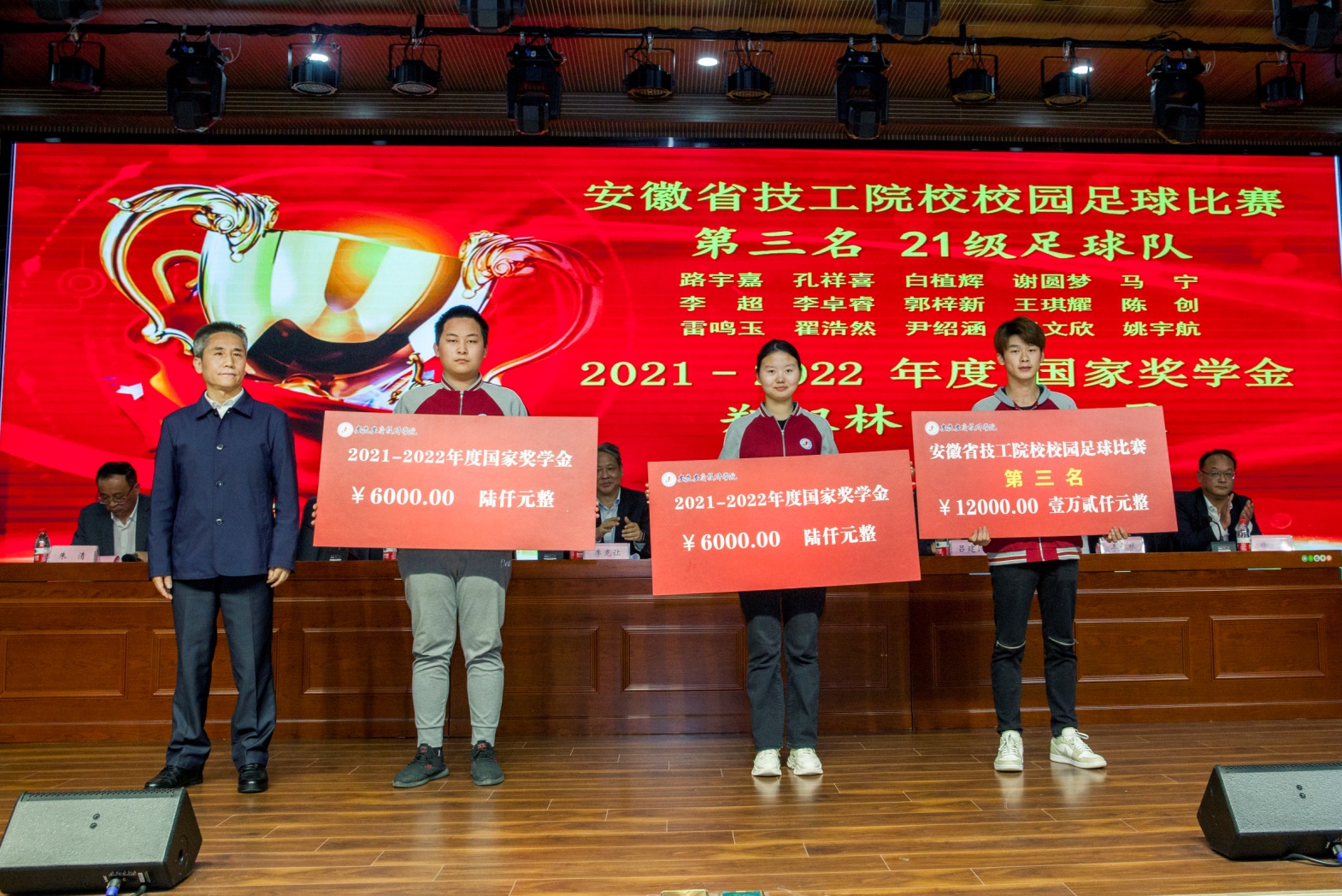 在欢快热烈的气氛中,市局领导和学院领导为在第九届全省职业技能大赛、安徽省服务制造应用技术技能大赛、全国服务制造应用技术技能大赛安徽省技工院校校园足球赛中获奖师生、2021-2022年度国家奖学金获得者颁发市级和院级奖励