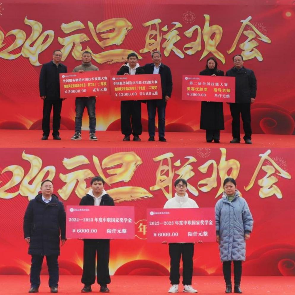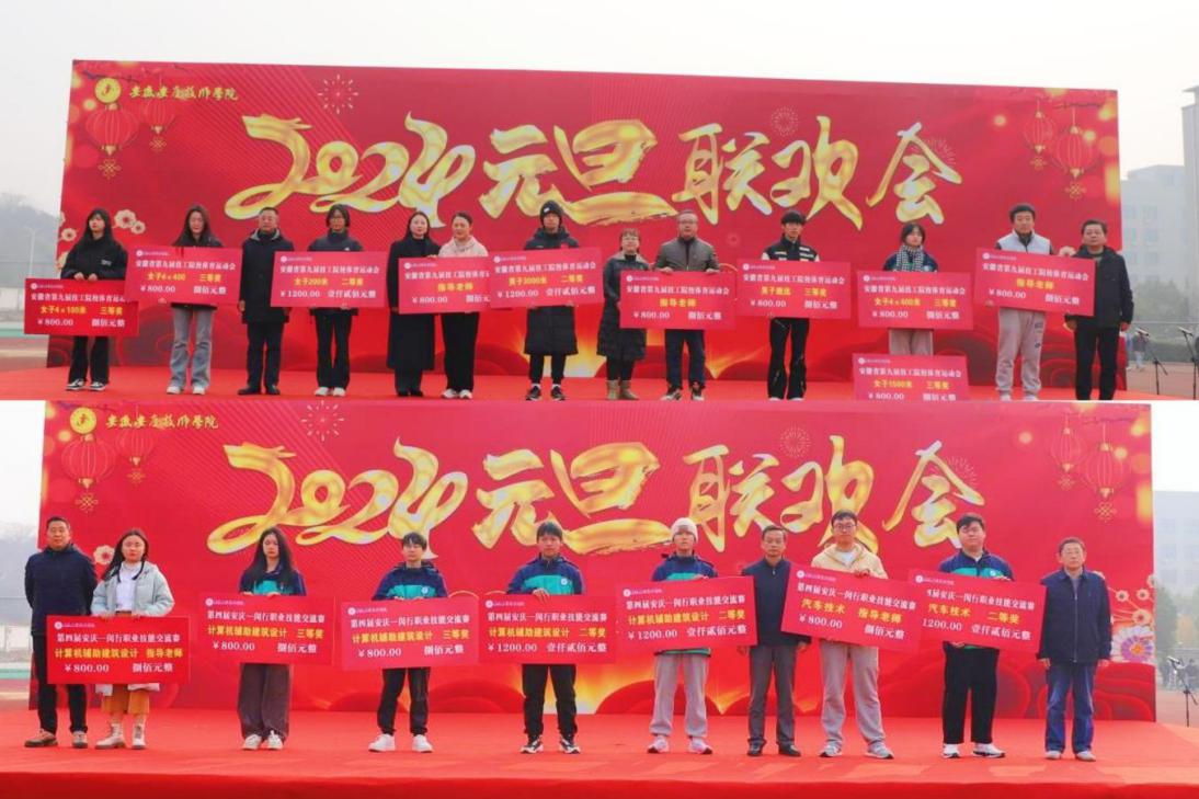 联欢会上还对在安庆—闵行职业技能赛、安徽省第九届技工院校田径运动会、2023年国家中职奖学金、第二届全国技能大赛上的获奖选手、指导教师颁奖。