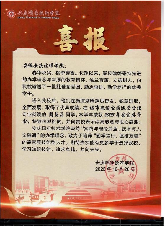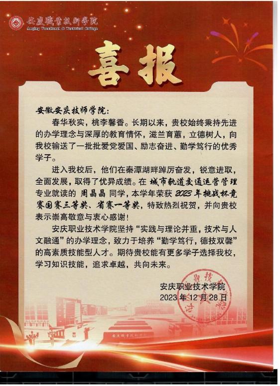 周晶晶同学为我校2018级城市轨道专业毕业生,在校期间各方面表现俱佳,并在2021年秋以优异的成绩考入安庆职业技术学院就读城市轨道交通运营管理专业。作为母校,对此深感欣慰,同时也衷心感谢安庆职业技术学院对周晶晶同学的悉心栽培!